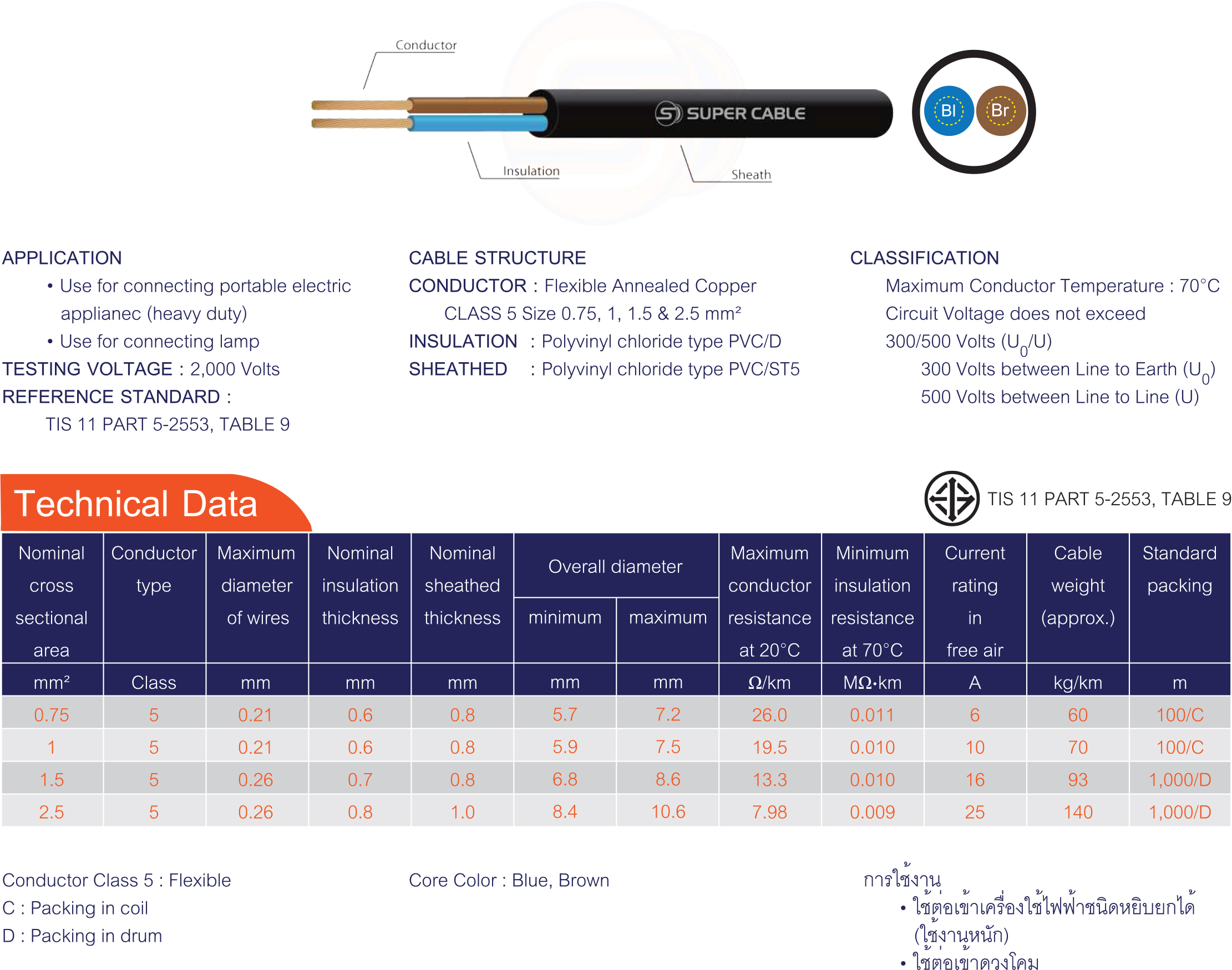 สายไฟชนิดตัวนำทองแดง/สายคอนโทรลและสายอ่อน | 60227 IEC 53, 2 CORES
