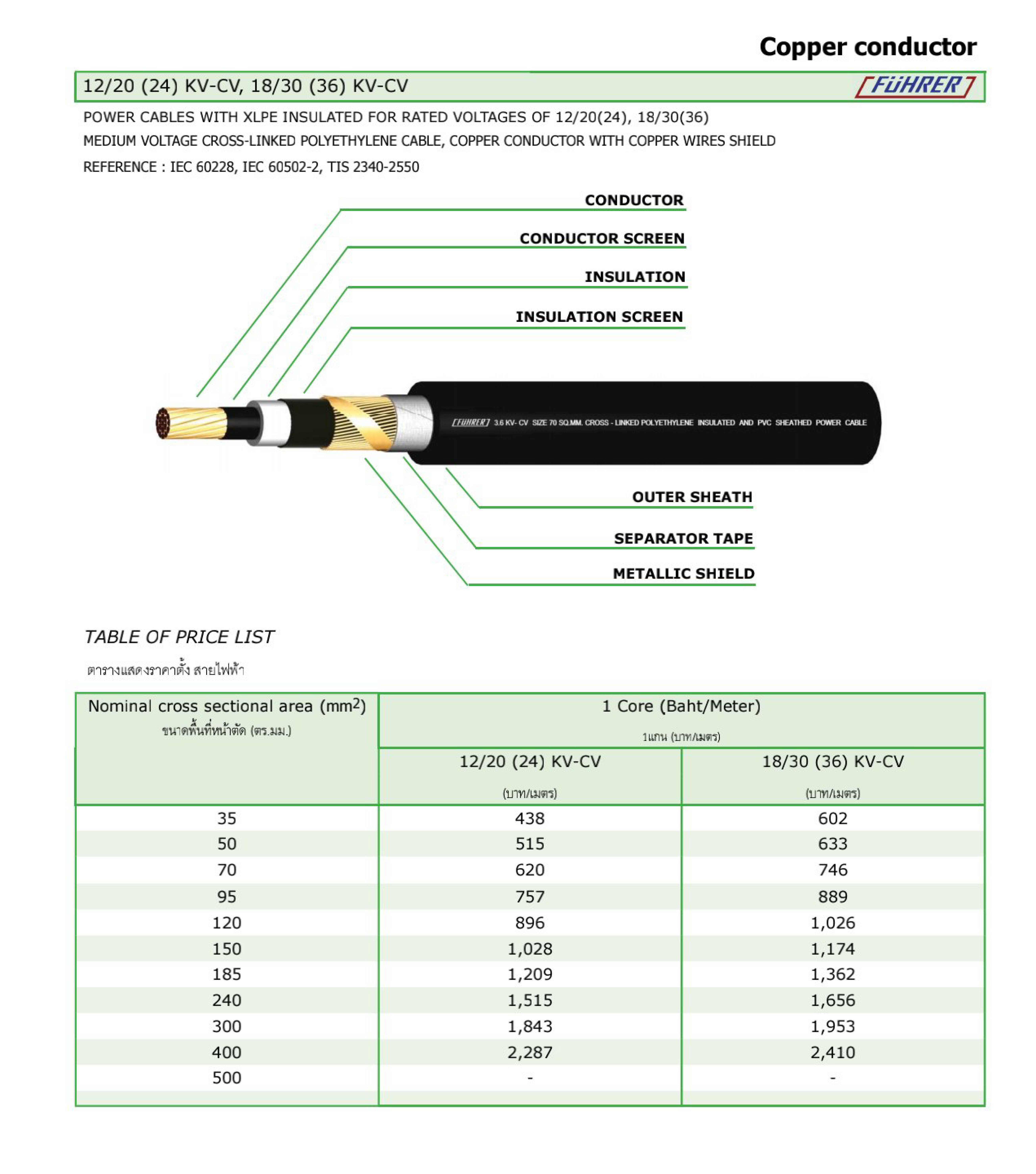สายไฟฟ้า ชนิดตัวนำทองแดง | 12/20 (24) KV-CV