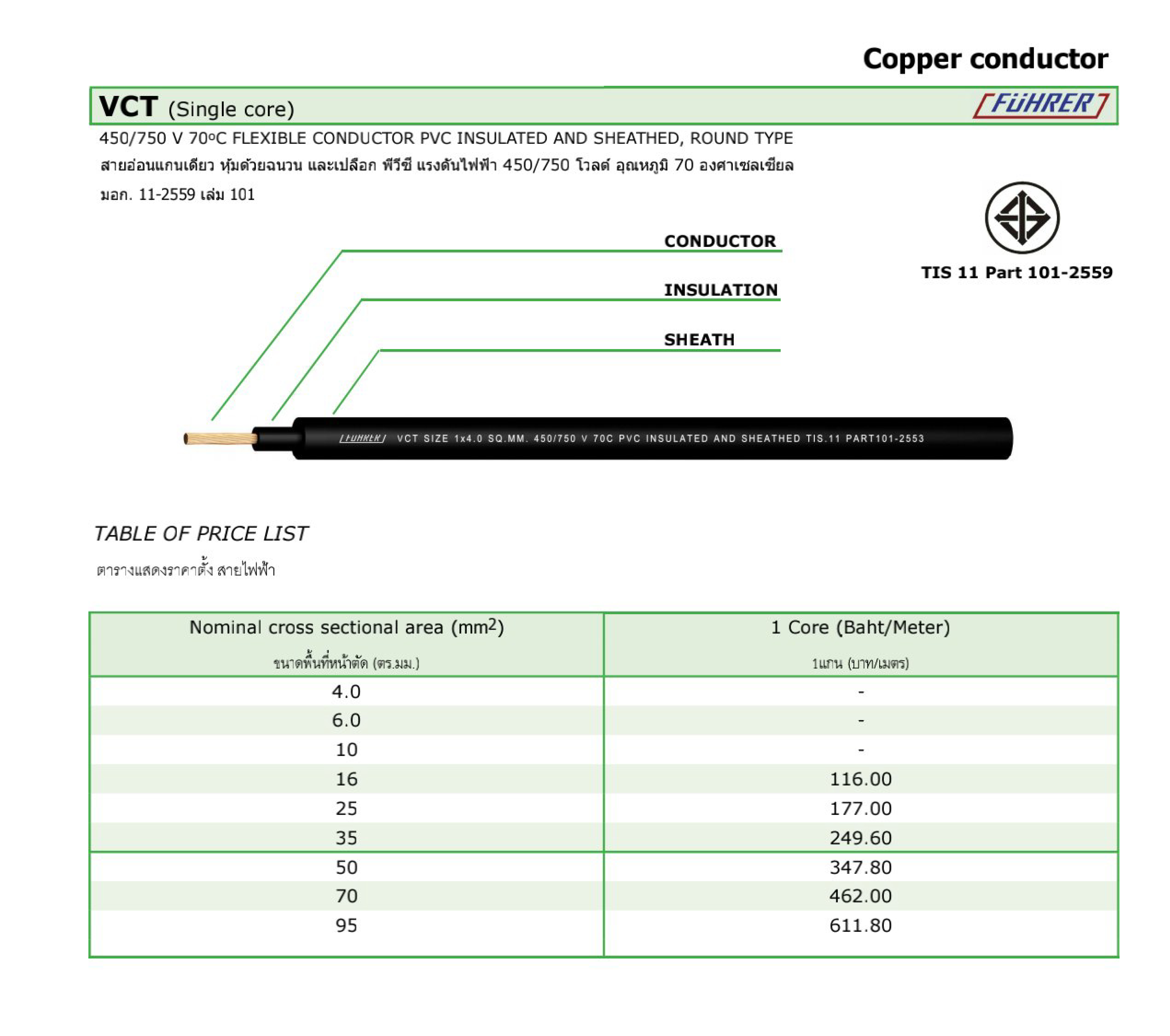 สายไฟฟ้า ชนิดตัวนำทองแดง | VCT SINGLE CORE