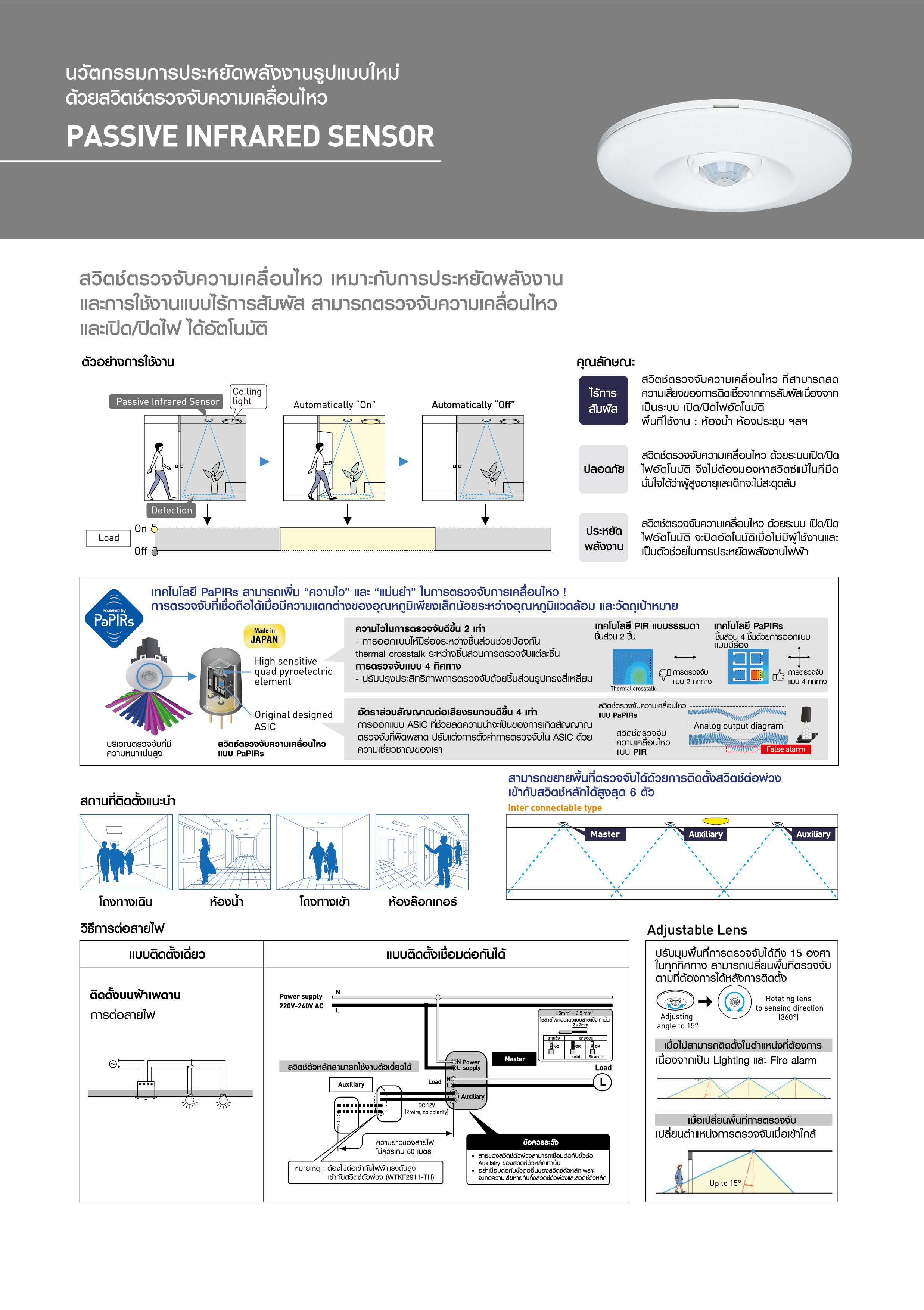 เมื่อเชื่อมต่อสวิตช์ตรวจจับความเคลื่อนไหวกับไฟแสงสว่างแล้ว สวิตช์จะทำการตรวจจับการเคลื่อนไหวของคนและระดับความสว่างในพื้นที่นั้น ซึ่งเมื่อมีคนเดินเข้ามาในพื้นที่ตรวจจับ ไฟแสงสว่างจะเปิดอัตโนมัติ และปิดอัตโนมัติเมื่อไม่มีคน หรือเดินพ้นระยะตรวจจับตามเวลาที่กำหนดไว้